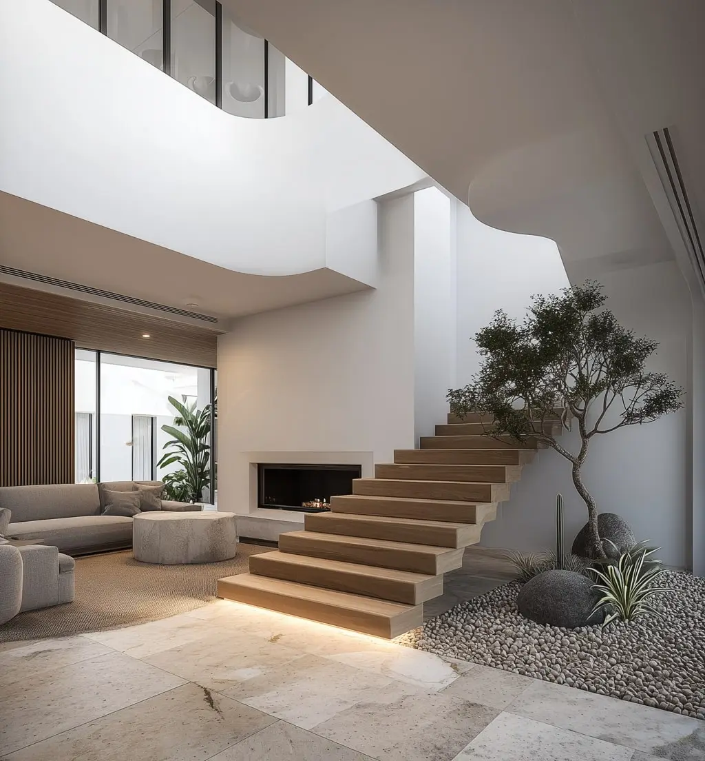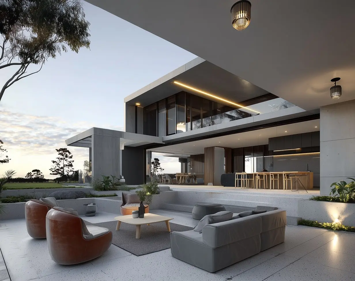 Clean geometric forms with flat or low-pitch roofs and strong horizontal lines. A restrained material palette—concrete, timber, glass, steel—used consistently throughout. Floor-to-ceiling glazing that connects interior and exterior spaces. Neutral colour schemes with whites, greys, and natural timber tones. Concealed storage and services that maintain the uncluttered aesthetic.